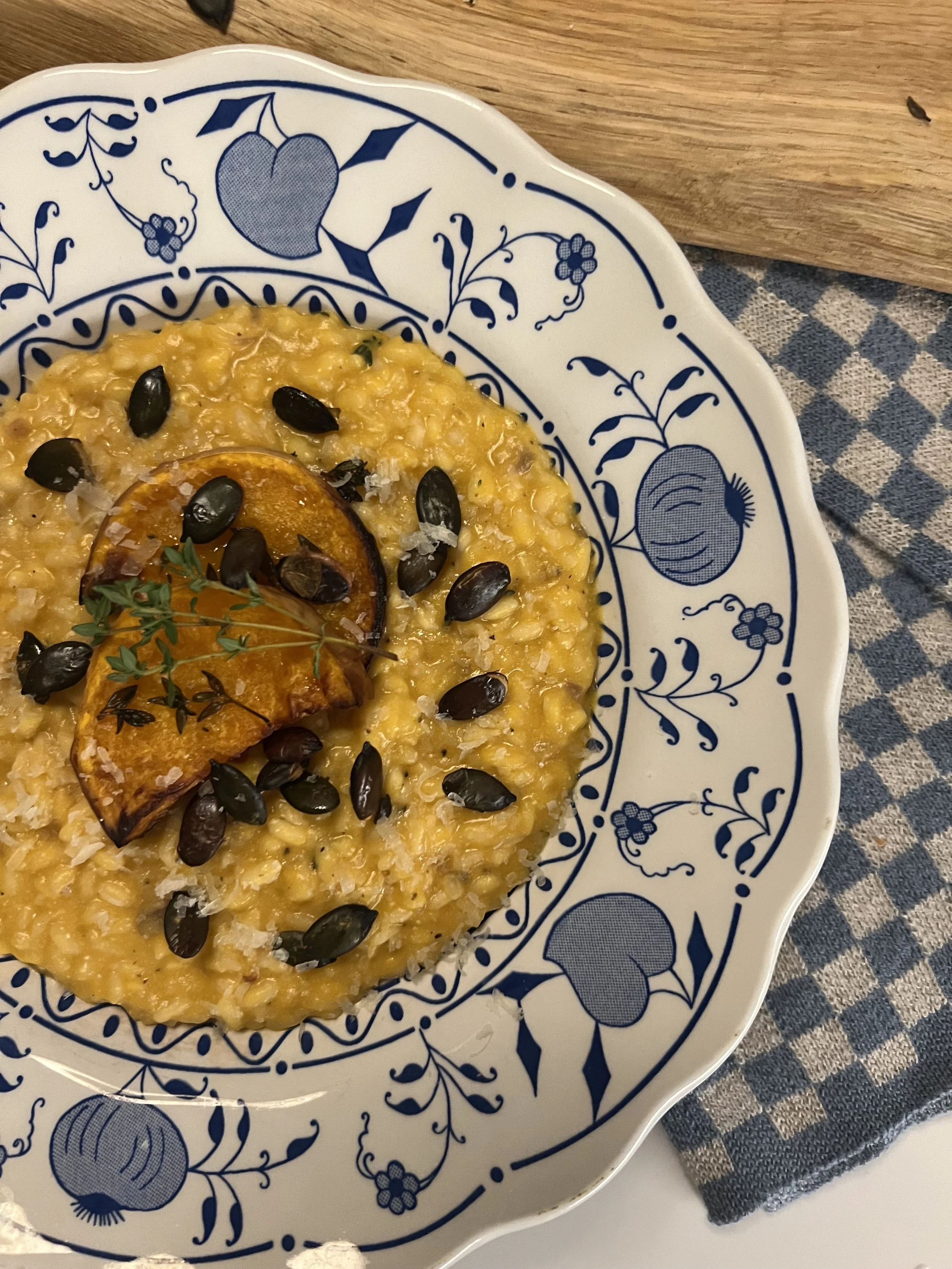 2. Top with roasted pumpkin: Add the reserved roasted pumpkin cubes on top of the risotto.
