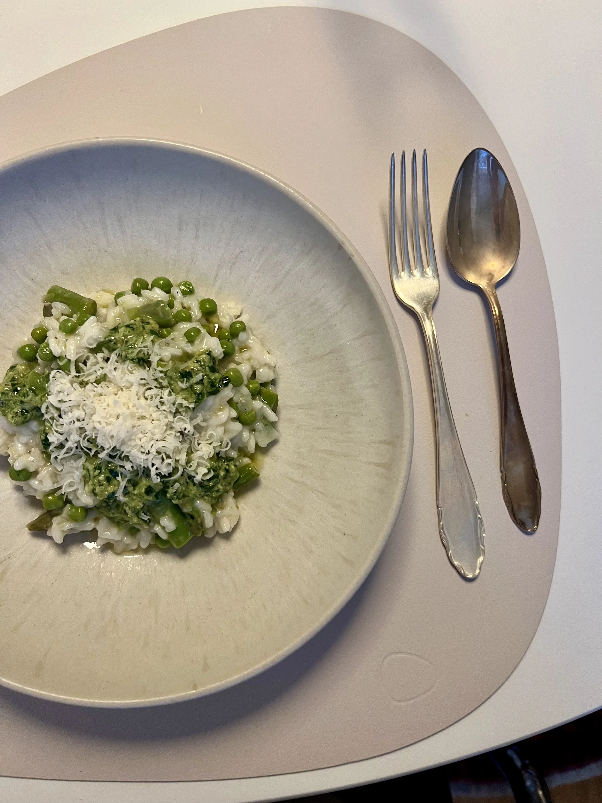 Plate the risotto and top with extra Parmesan and a generous dollop of wild garlic pesto. Drizzle extra olive oil over it if you wish.