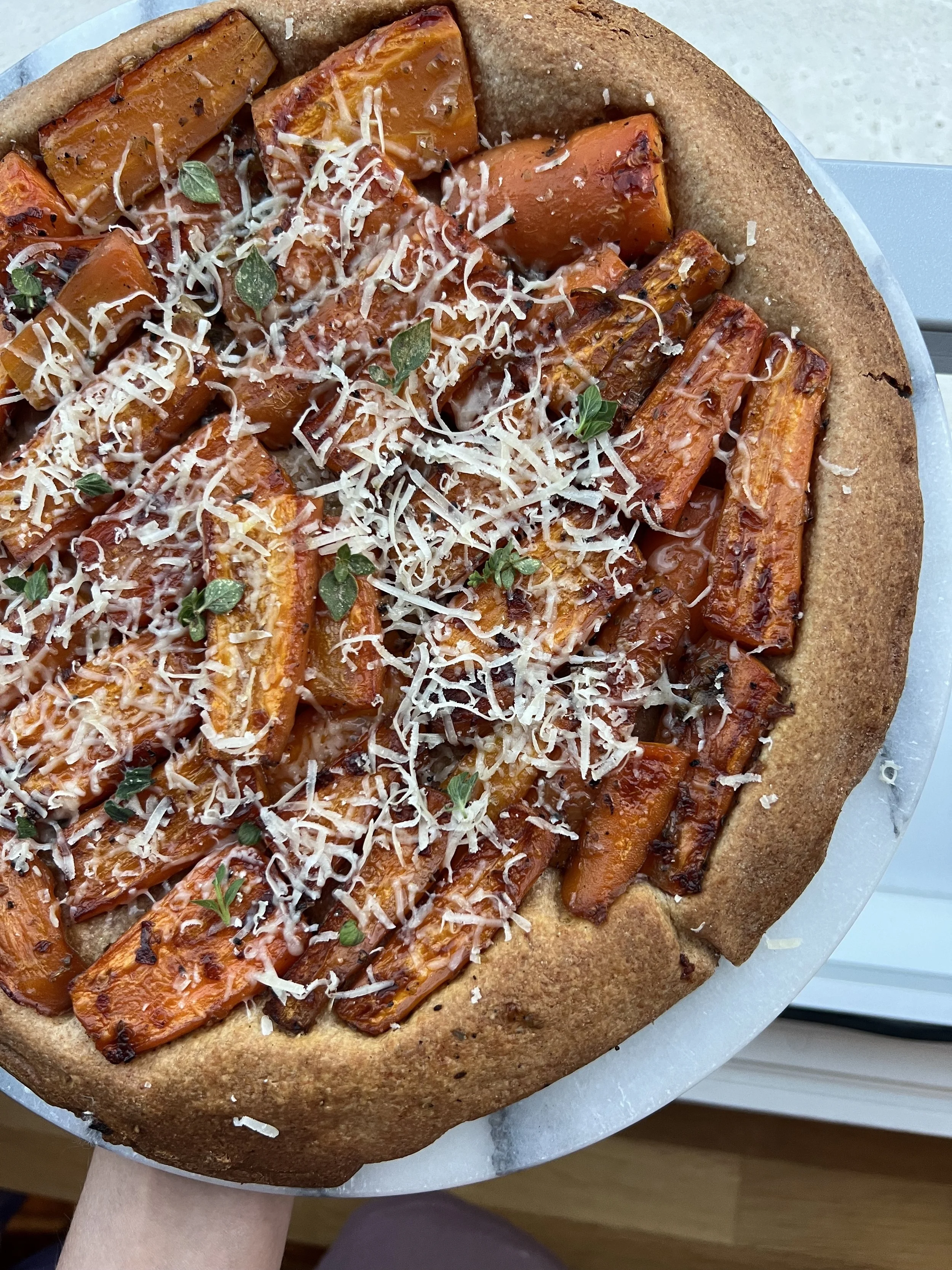 Serve warm as a savoury main dish or as a side with a crisp salad. Enjoy the Mediterranean flavours of the caramelised carrots combined with the earthy spelt crust!
