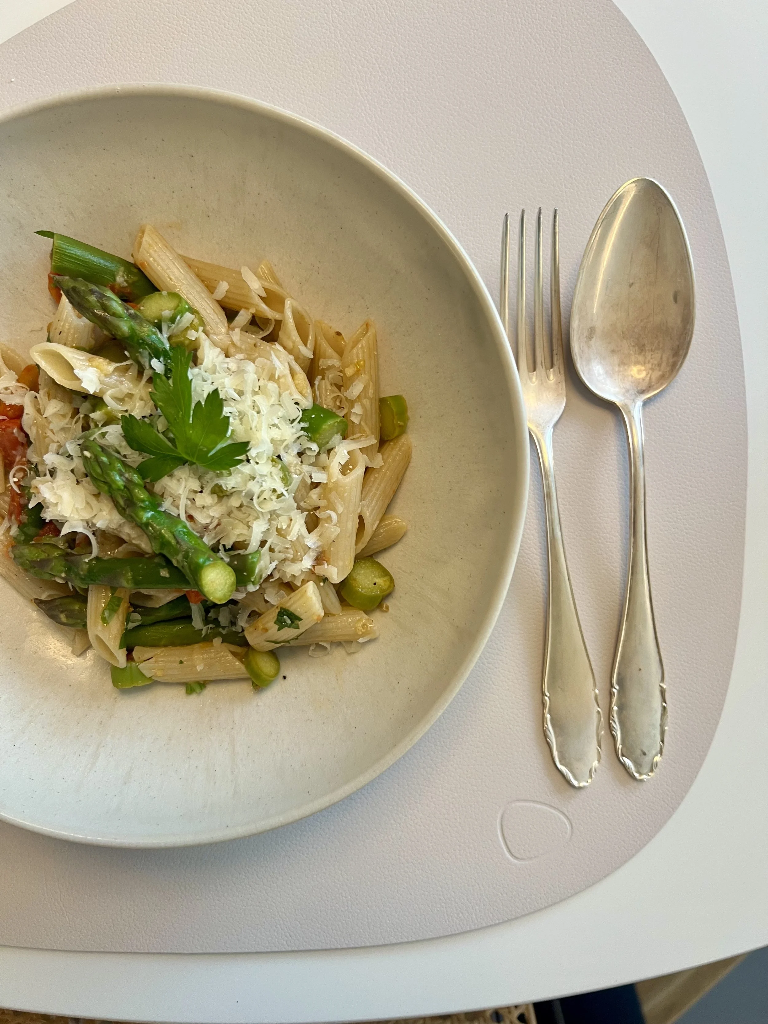 This pasta is everything I crave when spring really starts to show: fast, fresh, and deeply satisfying without being heavy. It's one of those throw-it-together meals that feels kind of fancy even though it’s super low effort. The sweet burst of cherry tomatoes, tender asparagus (especially those buttery tips), and that little hit of lemon make every bite feel like sunshine. And yes — it comes together in just 15 minutes. That’s what we like.