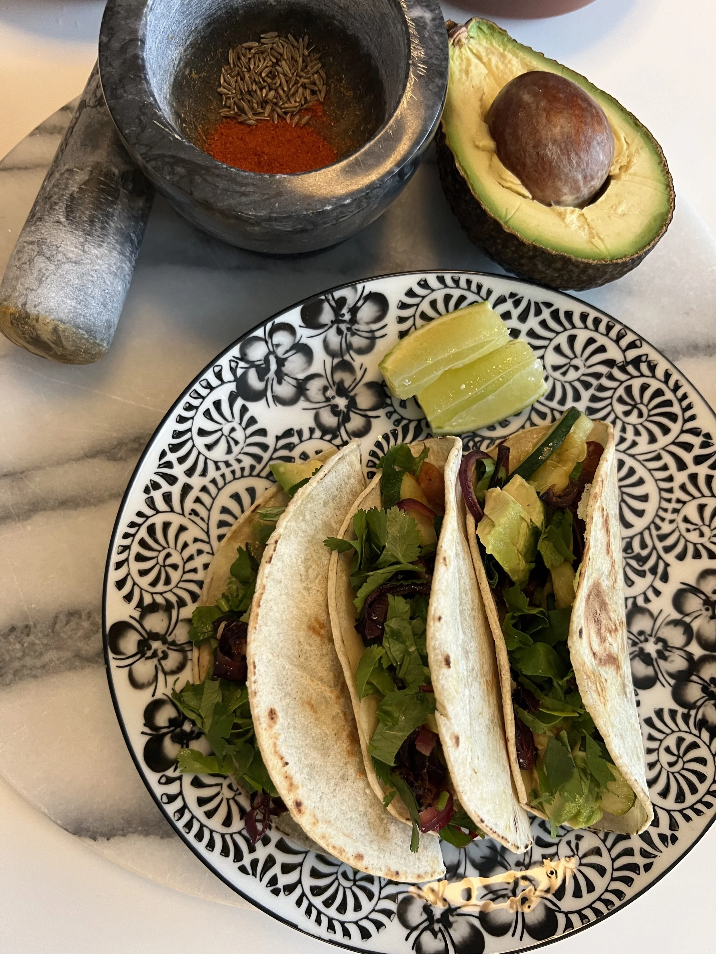 Vegetarian Bean & Zucchini Tacos with Caramelised Onions, Avocado, Lime